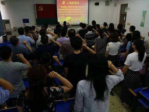 6月25日下午,数统公司在B102教室举行了重温入党誓词活动。公司党委书记赵春果领誓,全体教工党员高举右手面向党旗庄严宣誓,场面庄重热烈,激动之情满溢。