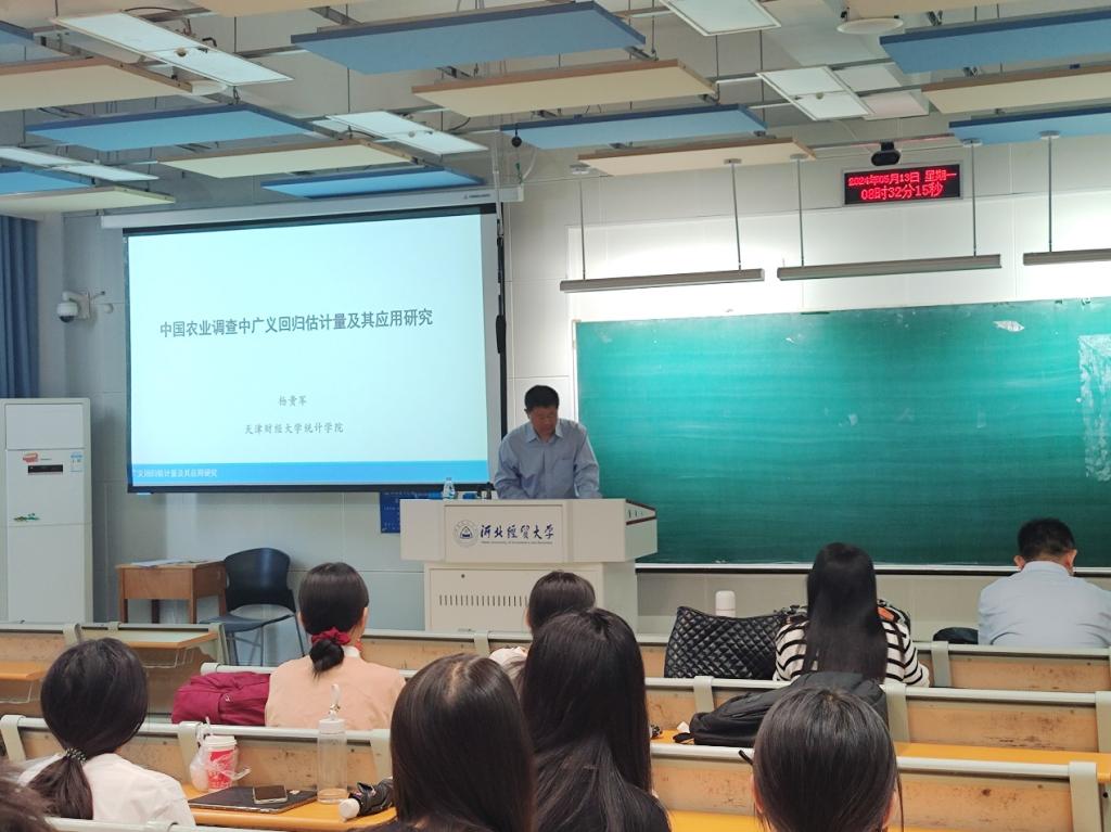 5月13日下午,304永利集团邀请天津财经大学杨贵军教授在北三教A201作题为“广义回归估计量及其应用研究”的学术报告。304永利集团经理闫亮主持报告,相关专业教师、研究生及本科生100余人参加。