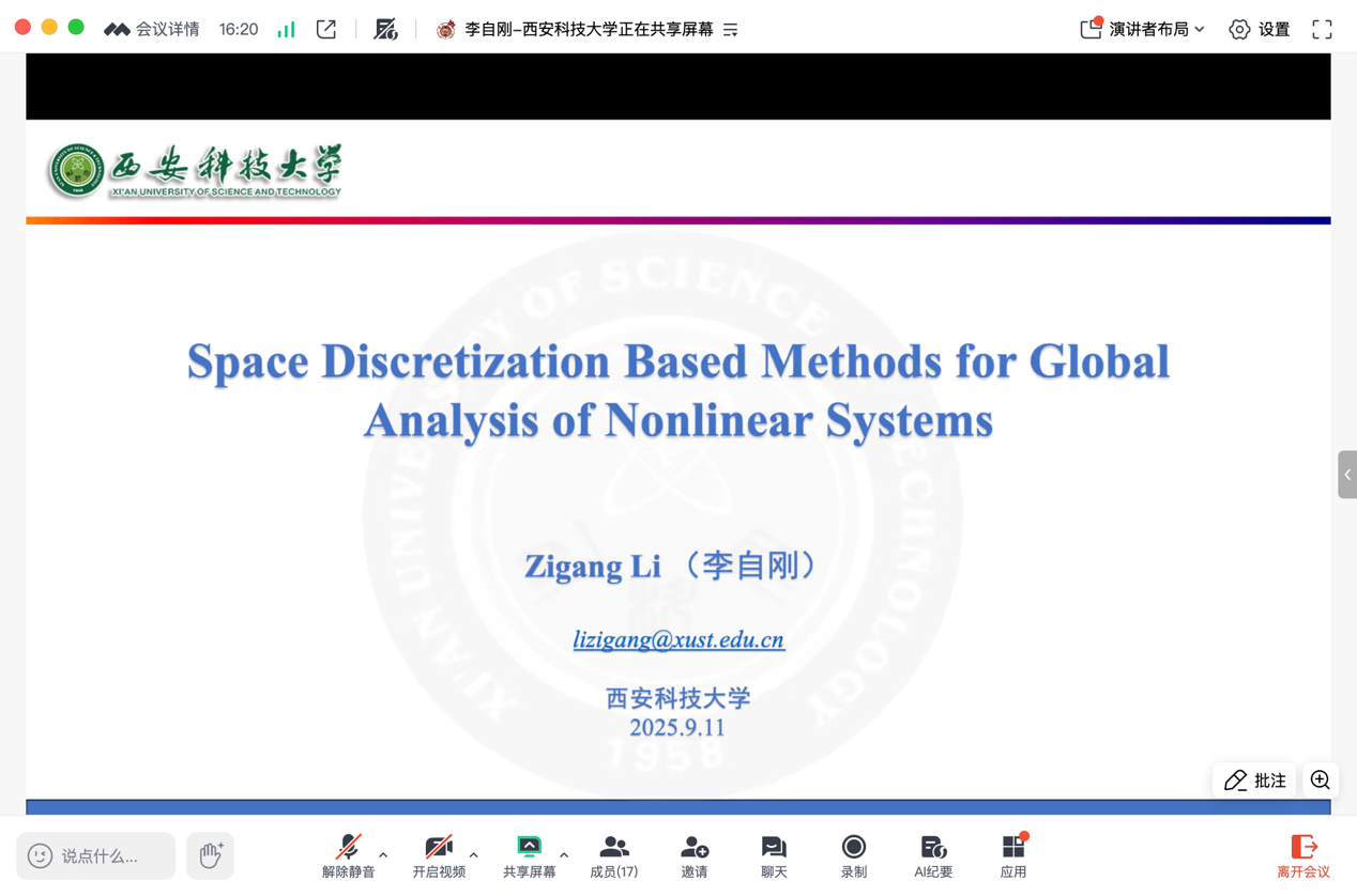 9月11日下午,陕西科技大学李自刚教授应304永利集团邀请在线上作题为“Spatial Discretization Based Methods for Global Analysis of Nonlinear Systems”的学术报告,相关专业师生20余人参会。