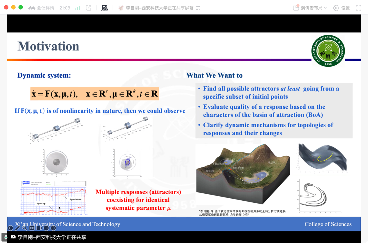 本次报告中,李自刚老师指出空间离散化是一种有效的策略,可以近似和可视化物理结构和固有动力学,因为它具有天然的容错和抗噪特性。然而,具有足够精细离散化分辨率的完整全局分析总会面临令人望而却步的计算负担,特别是对于高维和复杂系统而言。这种被称为“维度诅咒”的挑战,随着维度的增加,所需的网格和样本数量会呈指数级爆炸式增长。为了克服高昂的计算成本,我们基于空间离散化的思想,开发了几种新的数值算法,即用于捕获高维动力系统中基于模型的全局不变集的并行子域合成细胞映射、用于多自由度非线性系统全局寻零的子空间扩展技术以及面向边界的渐进学习法。