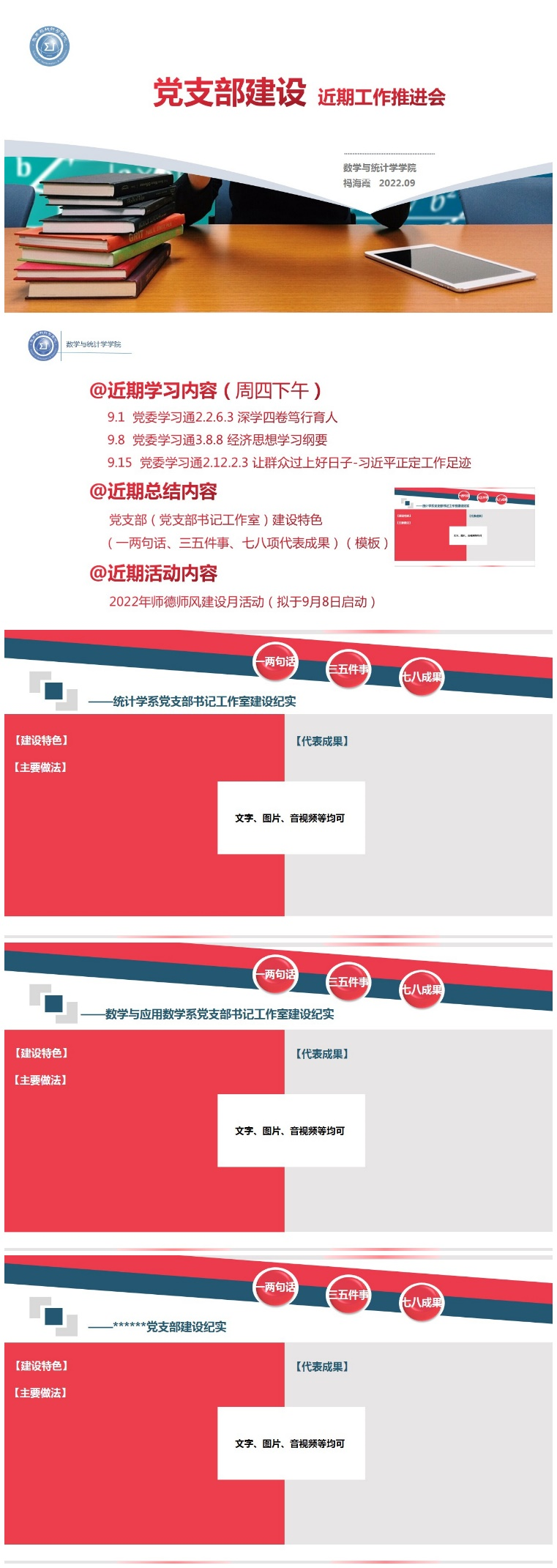 同时,推进会也对公司2022年度的师德师风建设月活动进行了通告,对各党支部及统计系、数学与应用数学系两个党支部书记工作室的建设特色凝练提出了基本要求,围绕“一两句话、三五件事、七八项代表成果”思路提供了展示设计模板,以期各党支部在工作特色及规律总结回顾中,推动各项工作再上新台阶。
