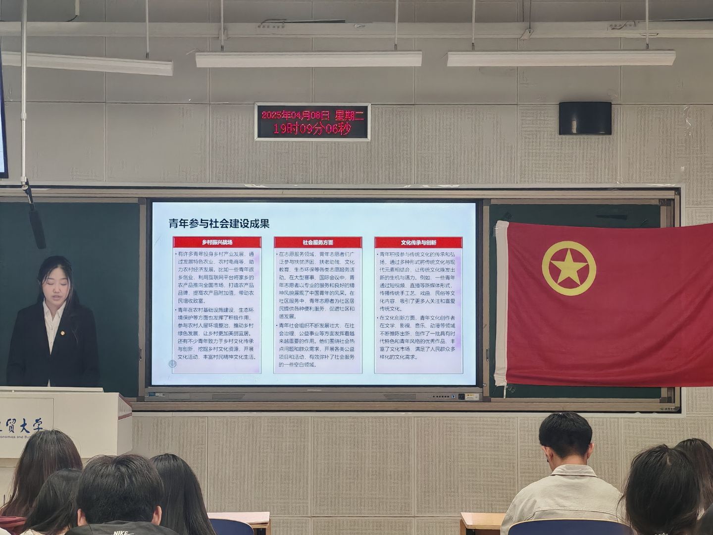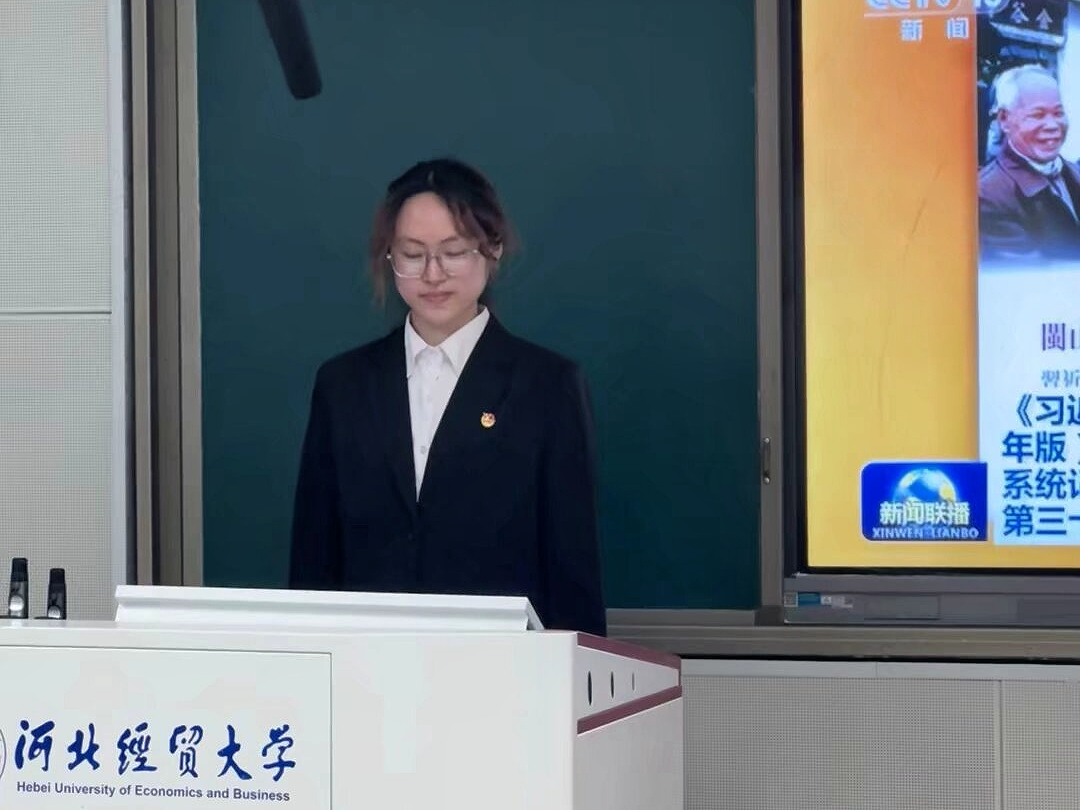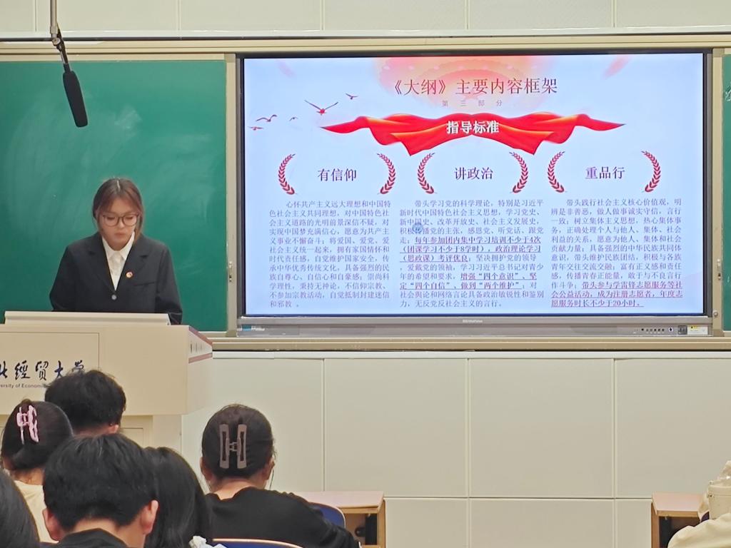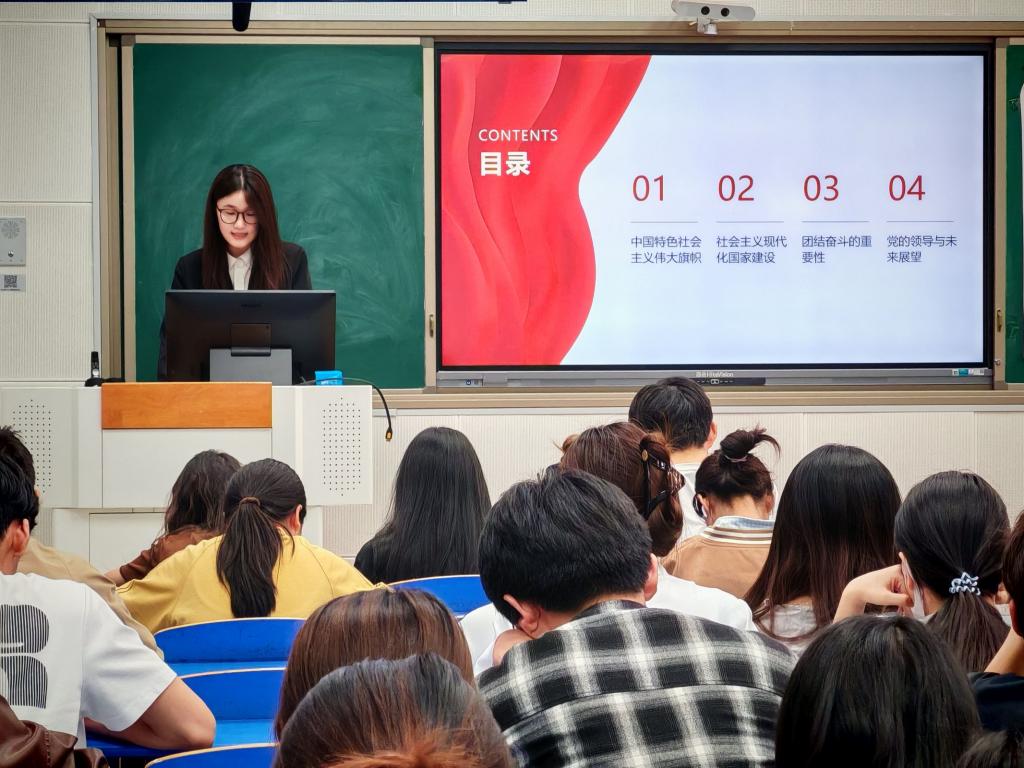 江思慧为大家深入解读了习近平新时代中国特色社会主义思想的形成理论基础、重要意义等,强调了青年应树立远大理想,践行社会主义核心价值观,担当时代责任。