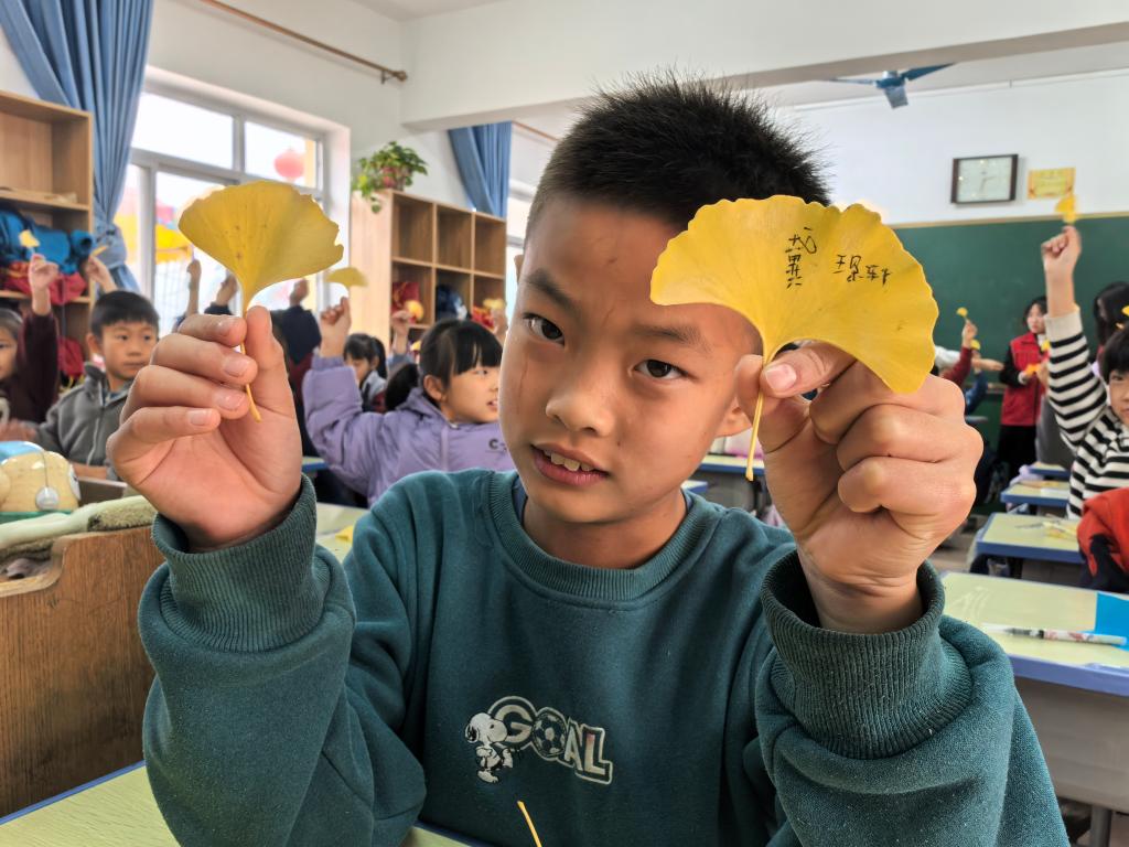 随后,志愿者们又将从经贸校园带来的特殊礼物—银杏叶分发给了孩子们,让他们在叶子上写下自己的名字。志愿者们又将叶子汇聚在一起,摆成爱心形状。一片银杏叶,一份教育情,志愿者们将知识带进大孙村小学,传递着爱与真情。