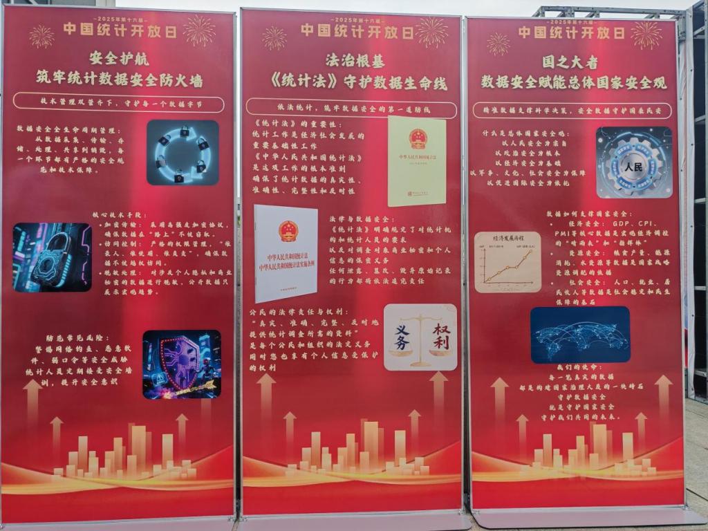 活动现场,公司以“数据赋能总体国家安全观”为主题设置了相应展区,展示“国之大者:数据安全赋能总体国家安全观”“安全护航:筑牢统计数据安全防火墙”“法治根基:《统计法》守护数据生命线”等内容;现场还设置了“红色统计史”“统计开放日沿革”“1%人口抽样调查”“第四次全国农业普查”展区,以图文并茂的形式展示统计事业的发展历程和重要成果。展区吸引了众多员工驻足观看,咨询台前专业人士与学子们进行面对面交流,现场气氛热烈,互动频繁。员工们通过现场互动,深刻体会到统计数据背后的责任与使命,纷纷表示要学好专业知识,加强实践锻炼,为统计事业长远发展注入经贸力量。