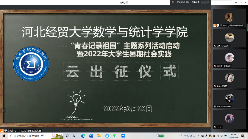 6月28日,数学与统计学公司“青春记录祖国”主题系列活动暨2022年暑期社会实践“云出征”仪式以腾讯会议方式举行。公司党委委员耿会清、专业指导教师申博、团委书记王洋出席仪式并发言,参与暑期社会实践活动的同学们参加活动。本次活动的主题是“喜迎二十大·永远跟党走·奋进新征程”。