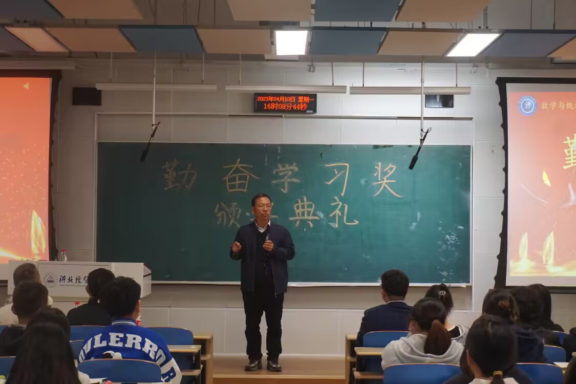 首先,耿会清宣读了数学与统计学公司2022年“勤奋学习奖”的表彰决定,与会领导登上讲台亲自为获奖同学颁奖并合影留念。接着,梁建英指出学习的重要性,同时强调了当代社会飞速发展,唯有不断加强学习、提升学习本领才可以在社会中立足,他勉励大家珍惜宝贵的学习时间,能够进一步明确学习目标,取得更好的成绩。