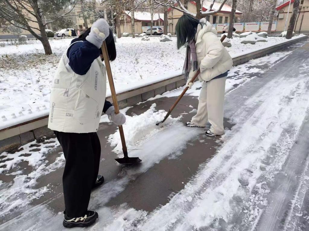 师生忙碌的身影,构成了一道靓丽的风景线,经过几小时的奋力清扫,积雪积冰情况得到缓解,一条条便于行走的道路重新出现在校园内,为师生的出行消除了安全隐患。