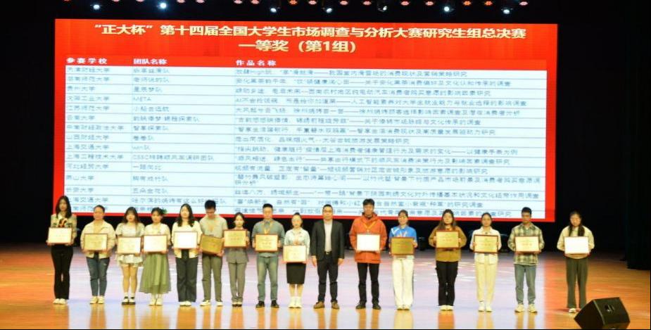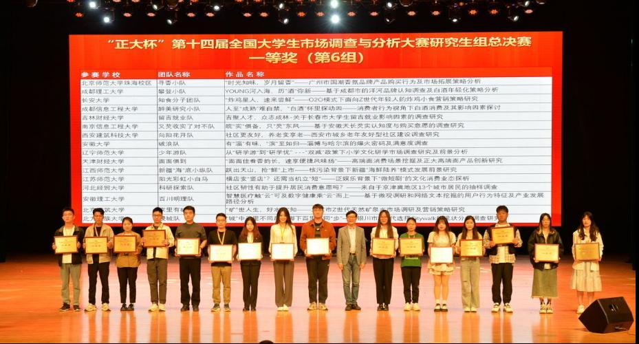 公司参加全国总决赛的两支队伍均荣获国赛一等奖,他们分别是由樊祥嘉、盖灿、杨京、康德旺四位同学组成的“一路向北”团队,作品名为《视频有流量,正定有“留量”——短视频营销对正定古城形象及旅游意愿的影响研究》(指导教师:董晓芳、张良勇、关菲)以及由崔帅、魏贺星、刘梦凡、田东鹭、王越五位同学组成的“科研探索”团队,作品名为《社区韧性有助于提升居民消费意愿吗?——来自京津冀地区13个城市居民的抽样调查》(指导教师:王琦、高星、郭立硕)。并且在大赛中公司被评为“正大杯”第十四届市场调查与分析大赛(研究生组)最佳院校组织奖。