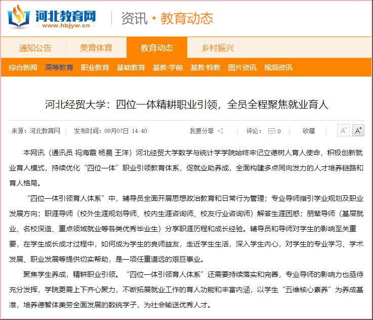 9月7日,河北教育网对祃海霞等撰写的《304永利集团:四位一体精耕职业引领,全员全程聚焦就业育人》进行了报道。